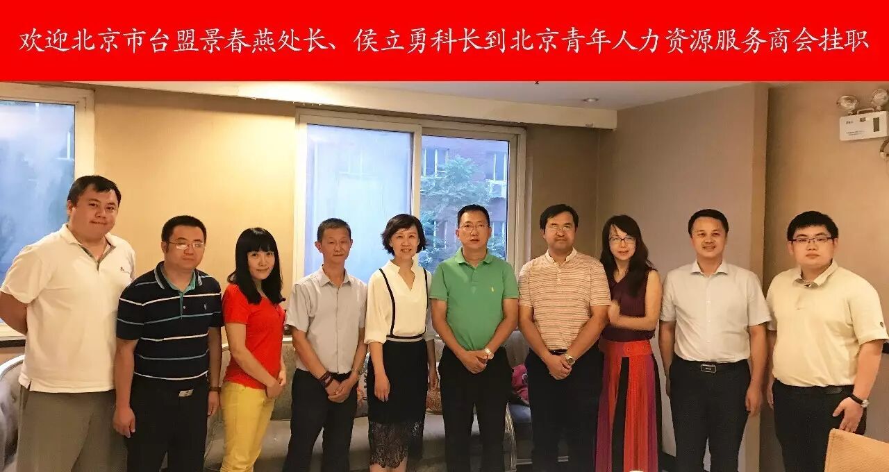 2017年8月25日北京市台盟景春燕处长和侯立勇科长到北京青年人力资源服务商会挂职。徐建军会长等商会领导班子举行欢迎仪式。