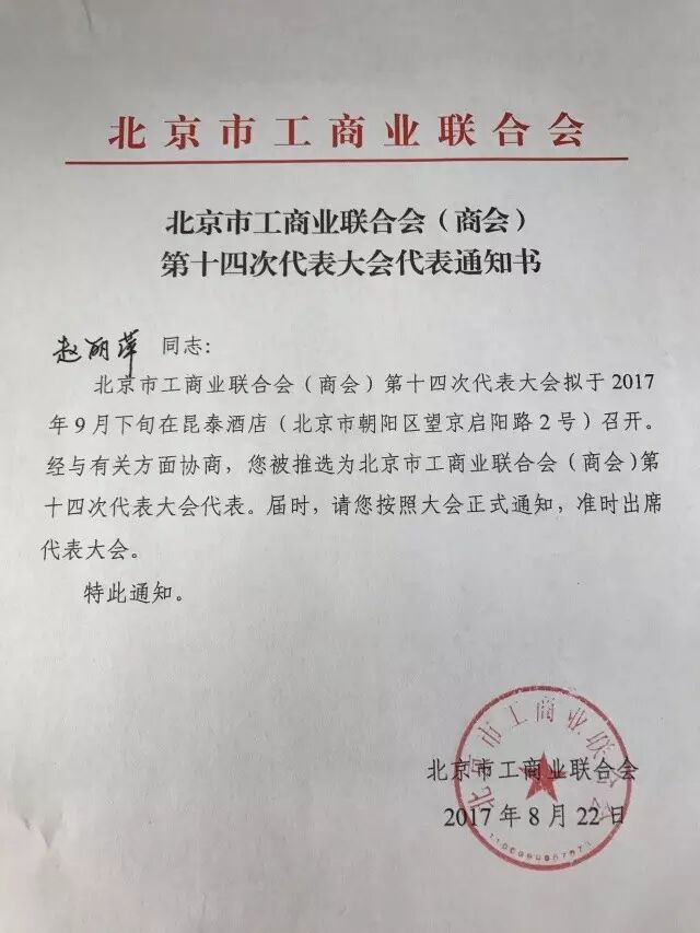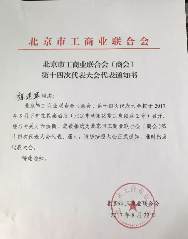 2017年8月25日北京青年人力资源服务商会会长徐建军博士、赵丽萍副会长及王尚峰副会长当选北京市工商业联合会(商会)第十四次代表大会代表。
